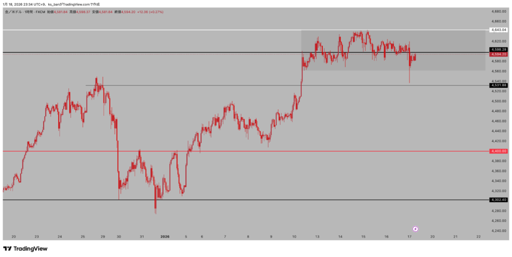 金チャート。自分の知識技術では買い辛い雰囲気なので、形待ちか銀を横目にその都度判断で見る。